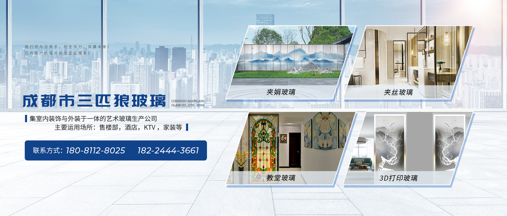 成都市三匹狼玻璃有限責任公司主要生產:夾絲玻璃、噴繪玻璃、雕刻玻璃、教堂玻璃、激光內雕玻璃...